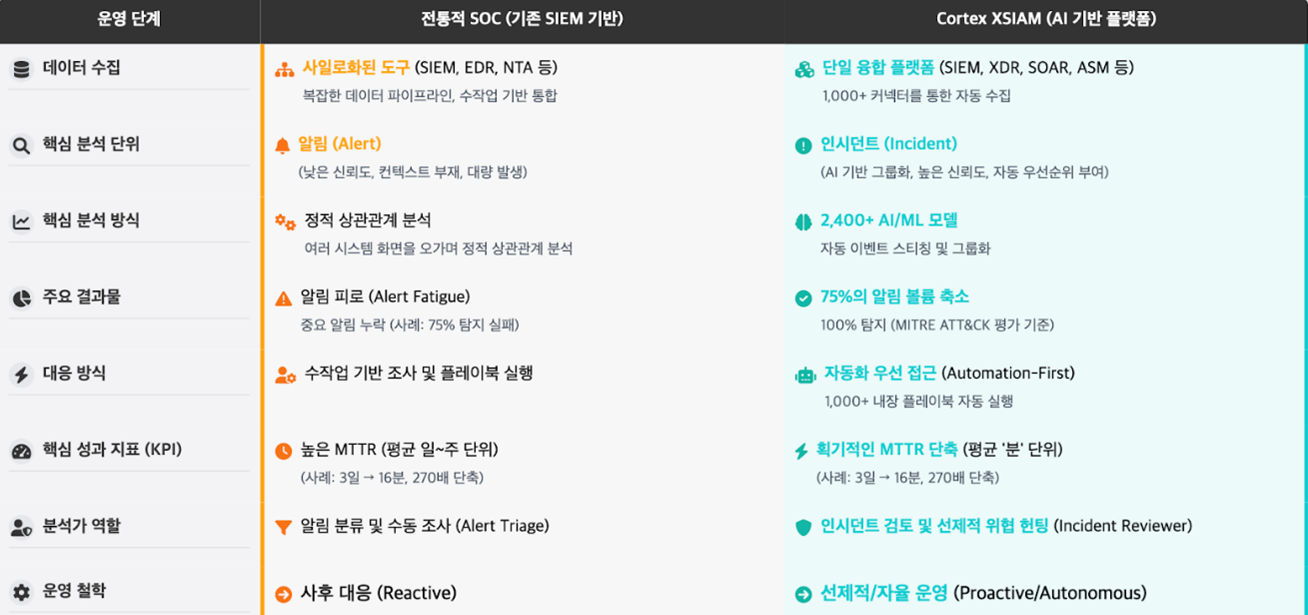 양사가 추구하는 차세대 SOC는 Cortex XSIAM에 뿌리를 두고 있습니다. Cortex XSIAM은 기존 도구를 대체하는 솔루션이 아니라, 기능과 데이터 통합, AI 기반 분석, 자동화라는 핵심 원칙을 통해 SOC 운영 방식을 재설계하는 수단입니다.